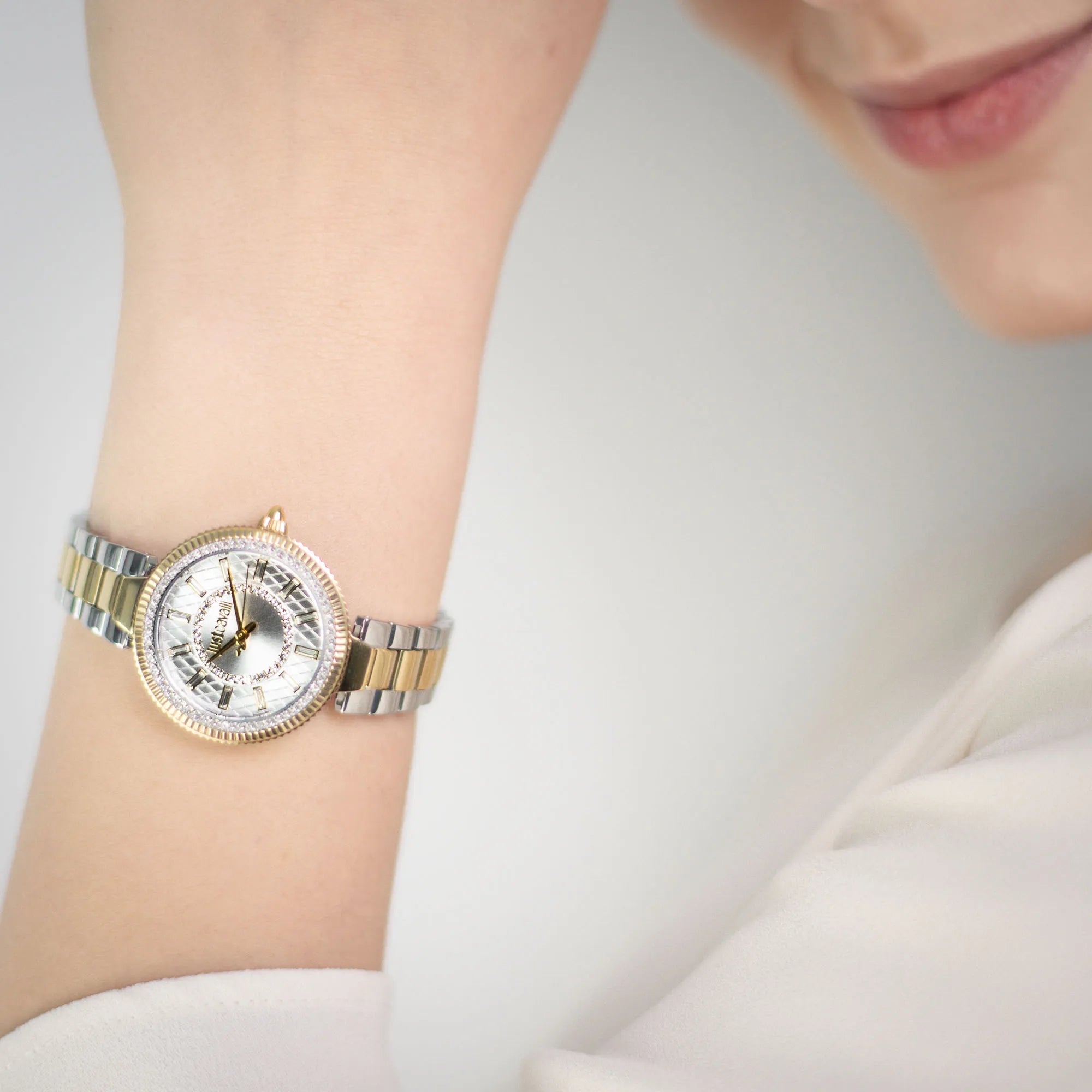 Ignite vibrant energy in a sleek, refined silver and gold palette with textured zircons shimmering under light from a polished surface. The smooth, cool touch evokes sophistication and confidence, while subtle movement of the hands reflects effortless elegance. Crafted for modern women embracing bold, stylish moments, it promises every occasion a touch of glamorous allure and urbane charm.